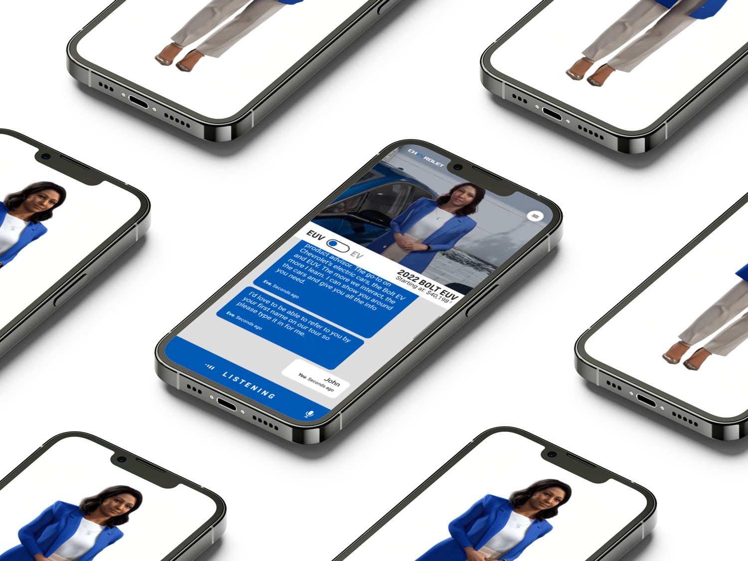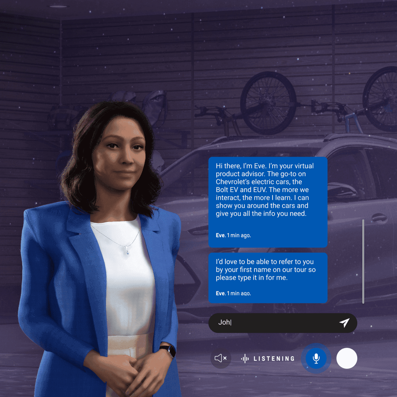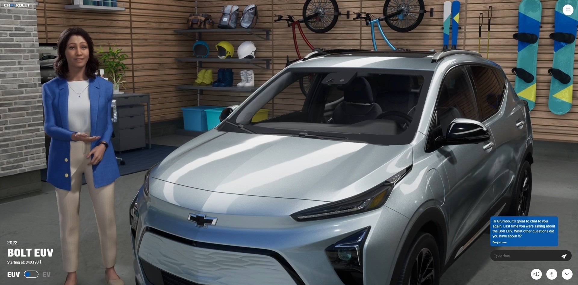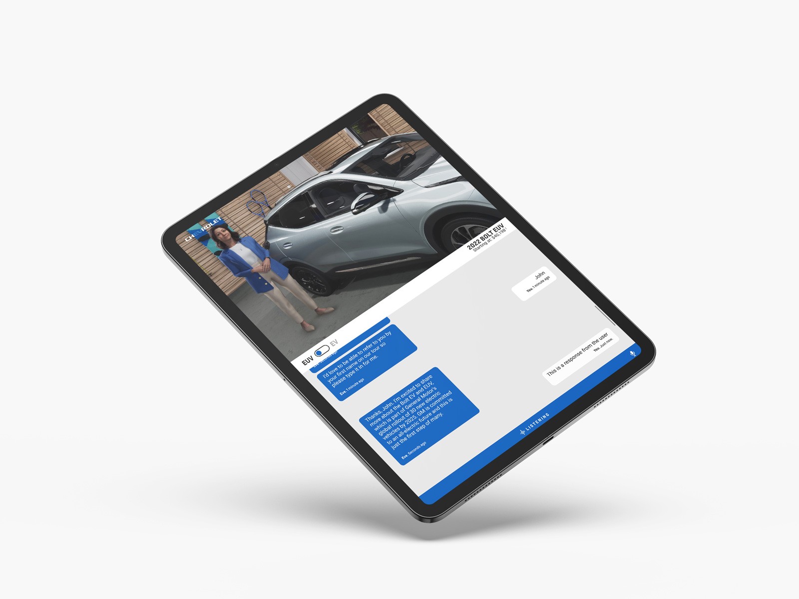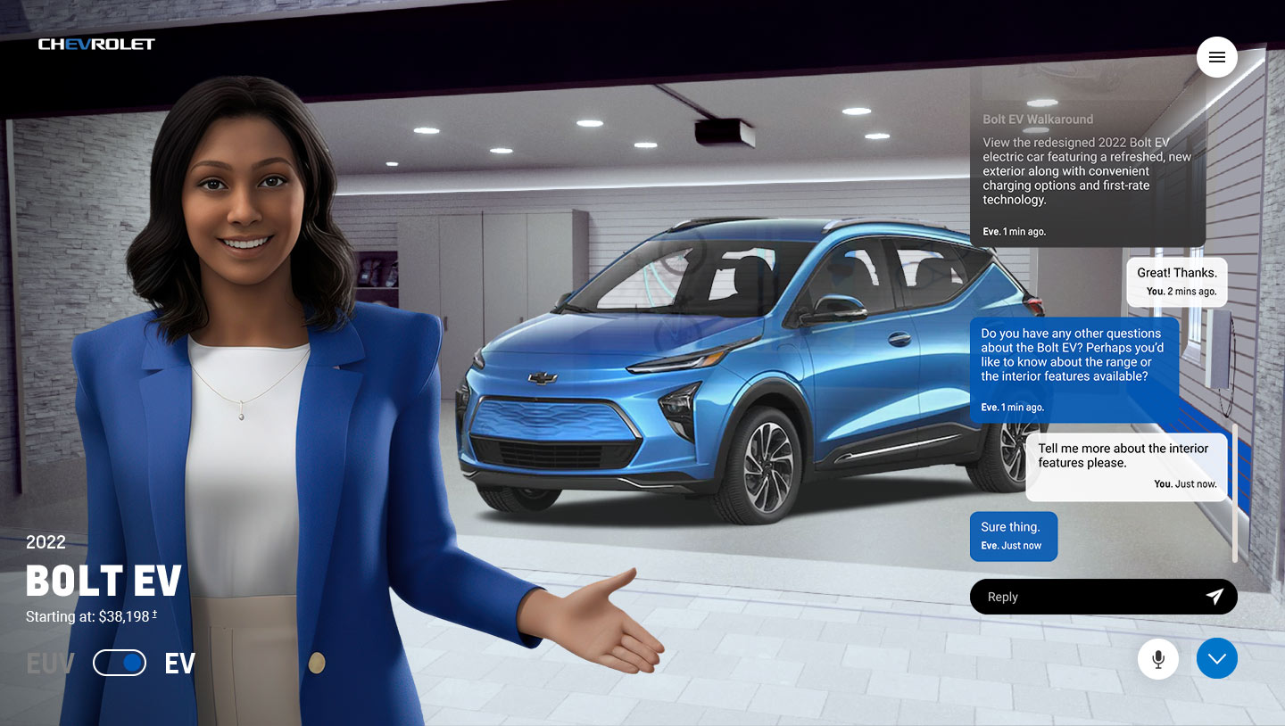 Visitors could chat naturally with EVE — by voice or text — as she guided them through the Bolt EV and Bolt EUV. Each interaction was transcribed live, giving users the option to talk or type seamlessly.